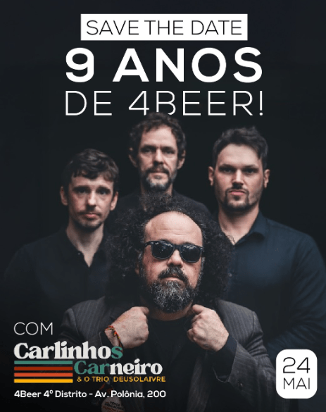 A entrada é gratuita. Então já sabe: risca a data na agenda, chama a galera e vem brindar com a gente esses 9 anos de 4Beer. A contagem regressiva já começou. Te esperamos aqui.